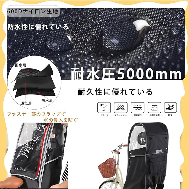 【防水性・耐久性もアップ】:耐水圧加工(5000mm)も施されている後ろ乗せチャイルドシートレインカバーが登場!生地の裏面にはPVCコーティングを施し、雨や風から完全ガード。レインカバーの本体生地は耐久性に優れた600Dデニールを採用されて、耐久性が更にアップ!