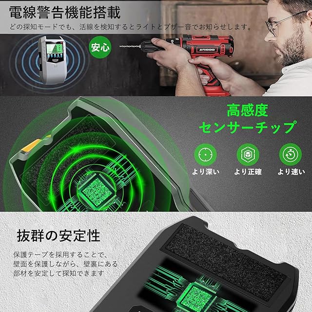 【より速くより深くより正確】高感度センサーチップを採用しており、安定性と高精度を実現し、正確な探知作業が行うことができます。下地チェッカーの探知範囲も広く、最大探知深さは浅モードは12.7mm、通常モードは25.4mm、深モードは38mm、金属は60mm、電線は51mmの深度まで探知可能な柱探しです。壁うら探しの正確性を確保するためには、校正を行うことができます。初期設定を行う場所を変更することで検知精度も変更できます。