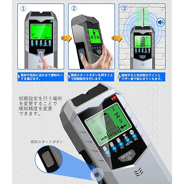 【5つのモード&木材と金属の区別可能】壁に穴を開けずに1台で間柱梁探知「深モード、通常モード、浅モード」、金属探知、電源探知の5つのモードを搭載し、木材・プラスチック・金属・AC活線などな様々な下地の素材を検知できる壁の下地探しです。壁の厚さによって間柱センサーのモードを切り替え可能で、木材と金属の判断も可能で、電線警告機能搭載なので作業の際に電線などを釘やネジで傷つけることなく安心して作業できます。