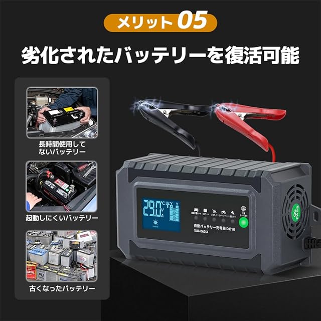 入力電圧:AC100V 出力電流:10A (充電時最 大) 適合バッテリー:DC12V/DC24V (開放型・密閉型・AGM)鉛バッテリー 適合バッテリー容量:4Ah~150Ah