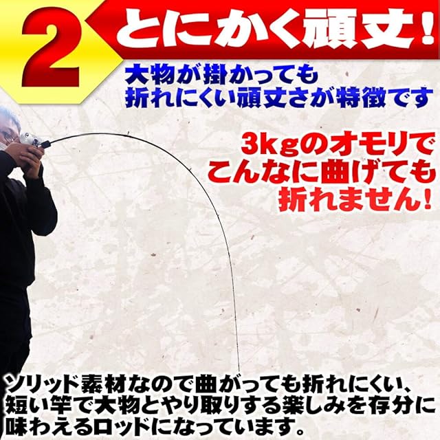 普通に釣りをするだけでは物足りないそこのあなた!<br> 管理釣り場でのトラウト(エリアトラウト)はもちろん、アジ・メバルのライトゲームから、チニング、ブラックバス、船釣りやタイラバ、ジギング、キャスティング、などなど、<br> あらゆる釣りがこの竿を使えばメッチャ曲がって楽しさ倍増!!<br><br> とにかく釣り人が遊ぶためのロッドを作りました。<br>お子さんや初めての方に使っていただくもよし。<br>カスタムして楽しんでいただくもよし。<br>短い竿で大物を狙うもよし。<br>様々な楽しみ方で使えるフルソリッド仕様です。<br><br>種類も長さが「3ft(90cm)/4ft(120cm)/5ft(150cm)/6ft(180cm)」の4種類から選べるだけでなく、リールのタイプに合わせて「ベイトタイプ/スピニングタイプ」から選べます!<br>しかもグラスソリッドも別のページあるのでよろしかったらそちらもご覧ください。<br><br>スペック<br>全 長:3ft(90cm)/4ft(120cm)/5ft(150cm)/6ft(180cm)<br>仕舞寸法:3ft(90cm)/4ft(120cm)/5ft(117cm)/6ft(147cm)<br>素 材:カーボンソリッド<br><br>※一部共通画像を使用しております。