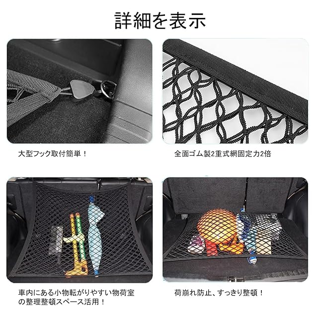 商品名:車用2層式ラゲージネット 全体ゴム製 2重式 ラゲッジ カーゴ トランク収納 (60cm×80cm)収納スペース確保 荷崩れ 落下防止 日本語説明書