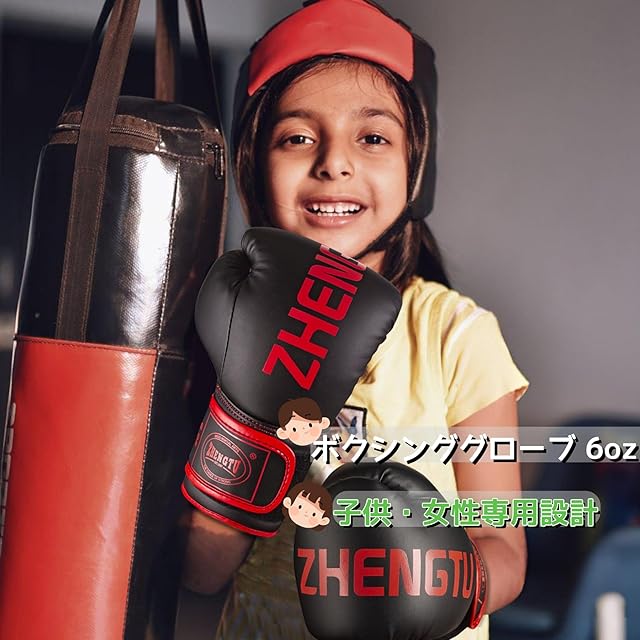 ZHENGTU ボクシンググローブ 6oz 【子供・女性専用設計・PUレザー・精密な重量管理・安全性と快適性・革新的な配色・ラテックス綿複合インナー・特殊な緩衝設計・滑り止めグリップ】 ストレス発散 運動不足解消 (黒赤, 6oz)