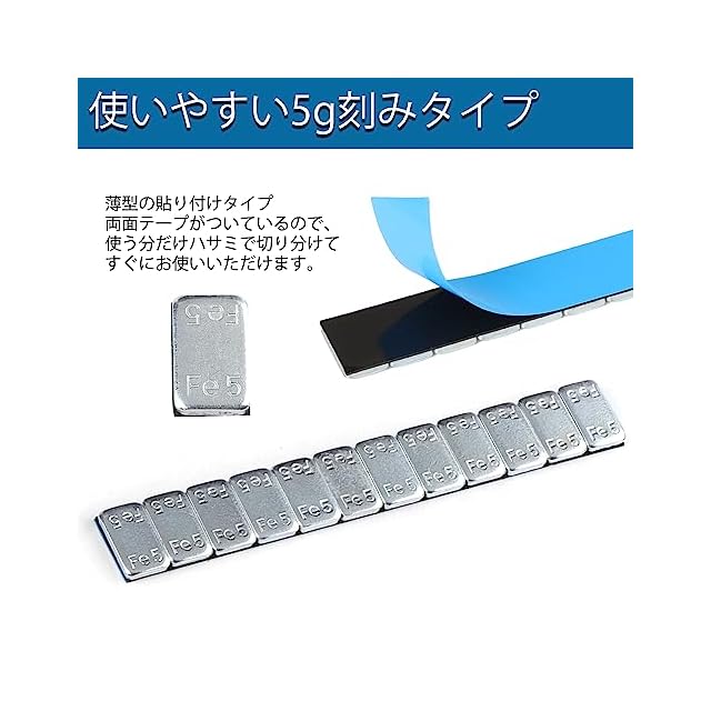 【簡単便利】5g単位で切れ目があり、ハサミで簡単に切り取ることができるので大変便利です。 ウェイト裏面には強力両面テープが付いているので、簡単に貼り付けできます。