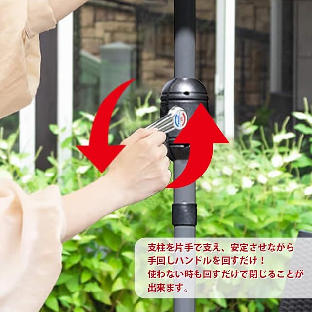 【簡単収納&携帯】: 取り外し可能なポールで簡単に分解でき、軽量で持ち運びが簡単なので、必要な場所で傘を使うことができます。パラソルの開閉には、普通の傘とは違いハンドル式を採用、クルクルと回すだけで開閉できるので、これほど大きなパラソルでも女性一人で簡単に開閉できます。