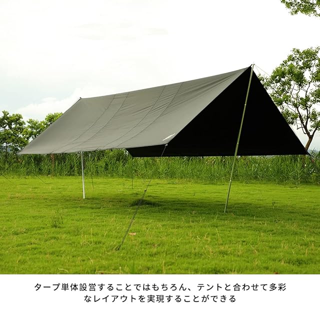 このレクタタープは、5.0m x 4.0mの大型で丈夫なポリエステル生地で作られており、ソーラーブロックコーティングとUPF500+のUVカット性能を備えています。防風性能も抜群で、風が吹いても引き裂かれにくく、暑いほど遮光率が上がります。また、防雨性能も高く、耐水圧5000mmで、雨の日でも安心してご使用いただけます。セット内容は、タープ本体、ポール、ガイロープ、ステンレスペグ、専用収納バッグなどが付属しており、アウトドアやキャンプなどで日除けに最適です。