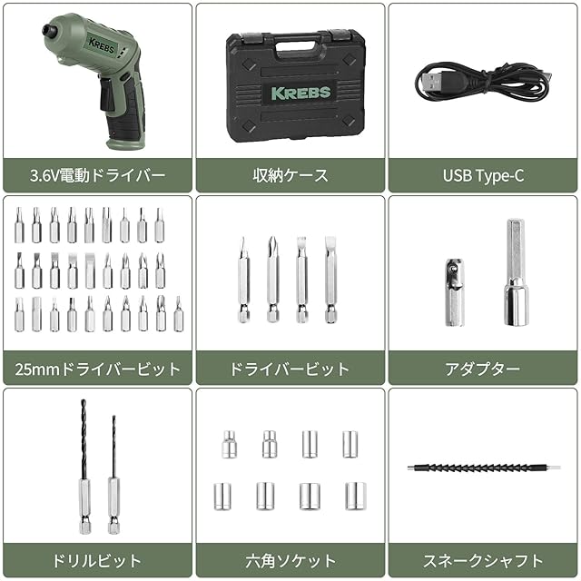 商品名:KREBS 電動ドライバー 小型 電動ドリル 3.6V Type-C充電式 47PCS 正逆切替 ドリルドライバー LEDライト付き 軽量 女性や初心者でも簡単に使える DIY向け 家具の組み立て 収納ケース付属