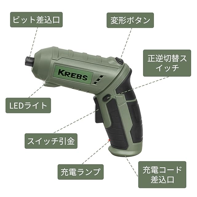 KREBS(クレブス) 電動ドライバー 電動ドリル 47本ビット 3.6V USB充電式 変形ハンドル 正逆回転 LEDライト付き 軽量 DIY 家具組立 家庭用