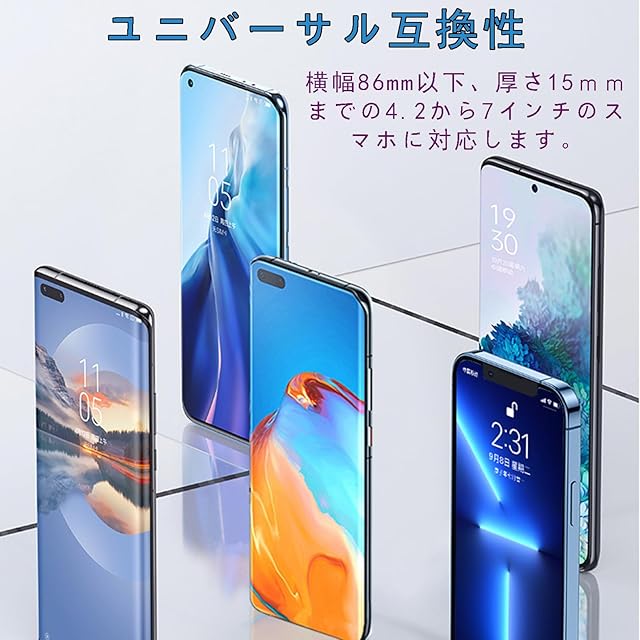 【ユニバーサル互換性】横幅86mm以下、厚さ15mmまでの4.2から7インチのスマホに対応します。iPhone、Galaxy、AQUOS、Xperia、XIAOMI、HUAWEIなどほとんどの機種に使用可能です。車載スマホホルダー固体素材で作られており、頑丈で信頼性があります車スマホスタンド持ち運びや設置が簡単なので、日常生活や旅行に便利です。