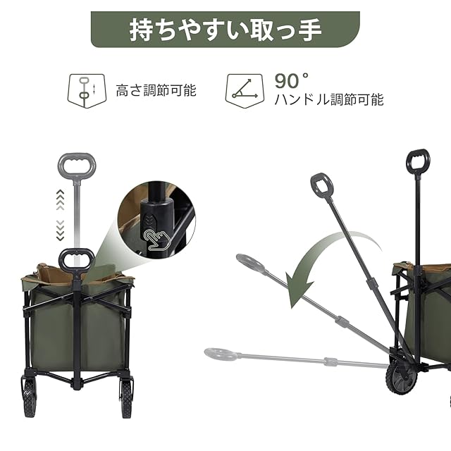 【大容量&特許取得のコンパクト収納設計】①、360°回転フロントホイールデザイン、小回りが利くので、曲がる・回るが思いのまま! ②、このキャリーワゴンは集束式で携帯便利、日本特許取得済みのコンパクト収納構造により、自宅でわずかなスペースに収まり、車のトランクにもすっぽり入る大きさ!③、90°可調節ハンドルで自由に使用可能、大容量アウトドアワゴンで、他ワゴンより深い。