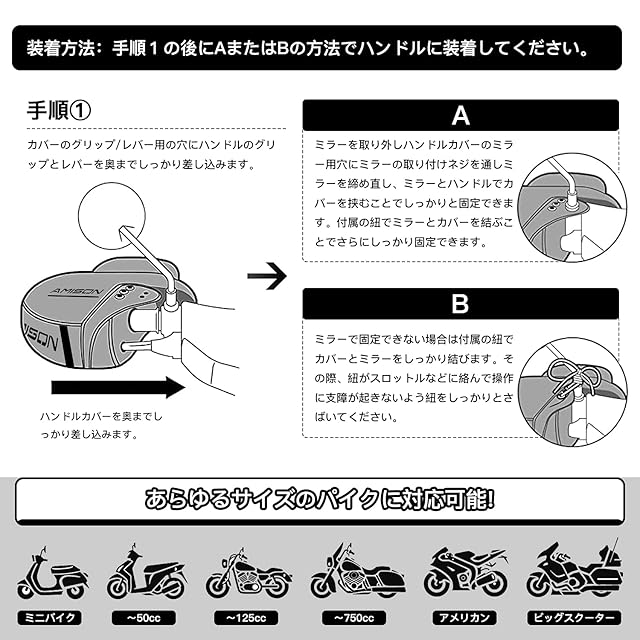 【汎用タイプ】バイクハンドルウォーマーは主に秋と冬に使用されます。いくつかの特殊型のバイクを除き、殆どの大、中、小型のバイクに適用します。ハンドルバーの仕様によって、2種類の取り付け方法があります。