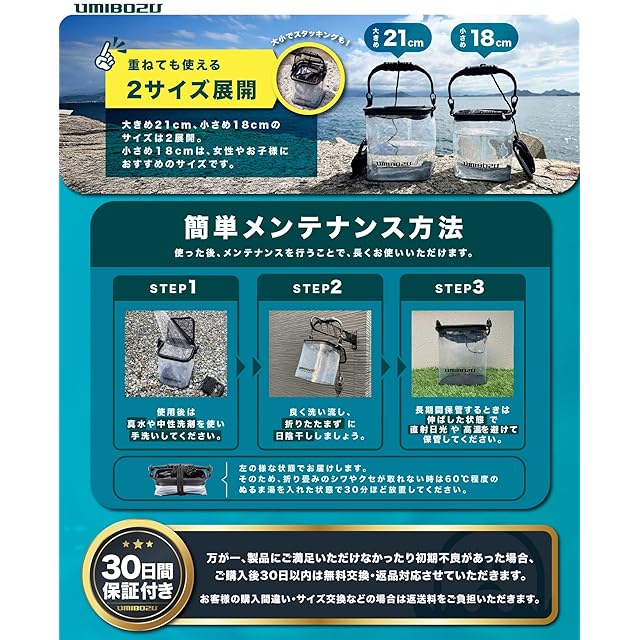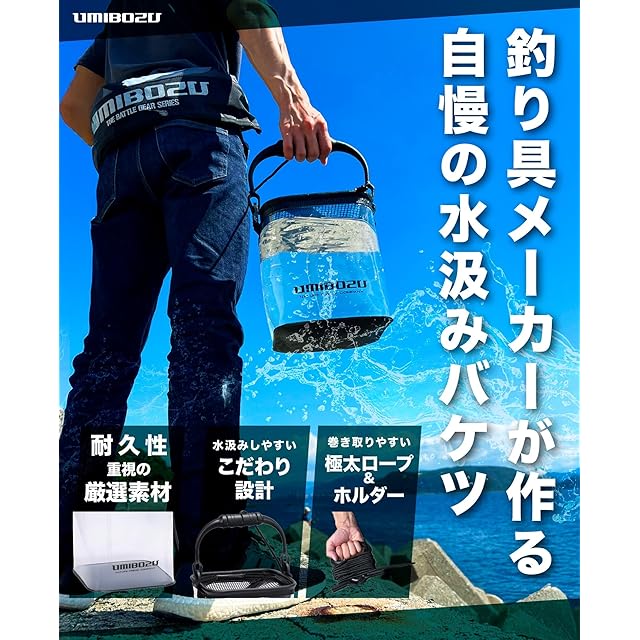 ウミボウズの釣りバケツは、折りたたみ式で持ち運びが簡単な透明のバケツです。水汲みや活かし入れに最適で、18cmと21cmの2サイズがあります。丈夫で耐久性に優れ、釣り場で大活躍すること間違いなしです。折りたたみ式なので、収納時も場所を取らず便利です。透明なので中の様子が一目でわかり、アジなどの活かしバケツとしても使えます。釣りの必需品として、アウトドアやレジャーにもおすすめのバケツです。コンパクトで軽量なので、持ち運びも楽々です。