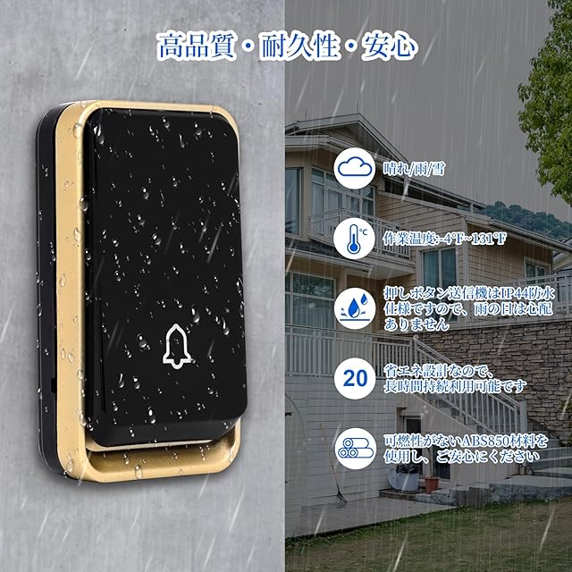 ✨【使用簡単&省エネ&防水設計】押しボタン式送信機を押すと、呼び出し音と同時にLEDが点滅してお知らせ!また省エネの設計なので、持続利用が可能です。また、押しボタン送信機は防水仕様(防水規格IP44相当)ですが、防水・防塵性能が優れており、屋外や風呂場でも使用でき、雨の日でも心配ありません。ご注意:水に浸けて使用することはお避けください。