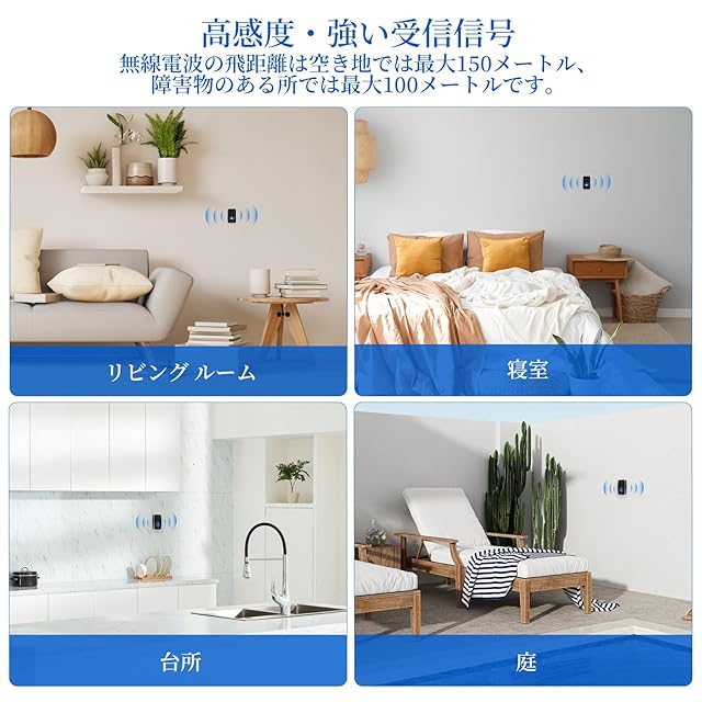 ✨【基本機能】定小電力のまま受信機感度をUpし、高品質、高感度受信機を採用されたので、無線電波の飛距離は屋外見通し、空き地では最大150メートル、障害物のある所(例えば建物や壁など)では最大100メートルの通信距離を達成できます。 受信機はワイヤレス式ですので配線不要になります。取り付けも簡単に設置できます。こちらのテストした結果、洋風式の建物は二階のところにもはっきりお知らせできます。