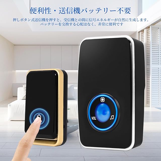 商品名:『バッテリー不要・配線不要』AURTEC ワイヤレスチャイム ワイヤレスベル 送信機1台受信機2台 ドアベル 玄関チャイム 呼び出しチャイムセット インターホン ドアフォン 防犯ドアベル 防水防塵 チャイム 配線不要 バッテリ不要 電池不要 4段階音量調節可能 呼出音楽51曲選択可【送信機1台受信機2台】(ブラック)