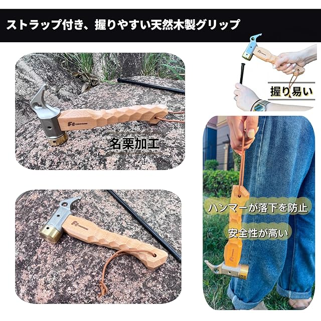 【軽量で丈夫な天然木製のグリップ】ハンマーの本体は、光沢があり大気中での腐食が少ないクロームメッキで塗装されており、防錆性能にも優れています。また、ペグや対象物を傷めにくい適度な強度を持っています。ハンマーの木柄には、天然木(ケヤキ製)を使用し、太さと曲線にこだわった設計になっています。グリップは、手に馴染みやすく、力を入れやすい丸みを帯びた名栗形状になっています。また、ハンドルの長さが19cmと短く、持ち運びやすく、特に女性に人気があります。全体的に、軽量で丈夫な天然木製のグリップが特徴です。