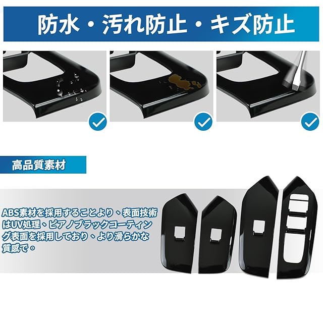 =【高品質素材】この内装パーツはプレミアムABS素材で作られており、表面技術はUV処理、ピアノブラック表面を採用しており、より滑らかな質感で、ピアノブラックの外観は、車に豪華でエレガントな感触を与えます。プリウス60系専用パーツ取り付け後、傷がつきにくく、ウインドウスイッチを傷から保護します。また、ウインドウスイッチに元の傷も被せます。