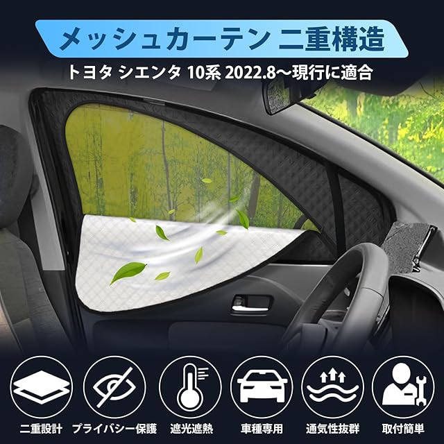 【二重構造&高密メッシュ】MWWM トヨタ シエンタ 10系に適合 メッシュカーテン SIENTA 3代目 2022.8~現行 サンシェード カーシェード 換気 UVカット 虫避け 運転席 助手席 簡単着脱 遮光 断熱 インテリア 日よけ 車種専用 アクセサリー 収納袋付き 2枚
