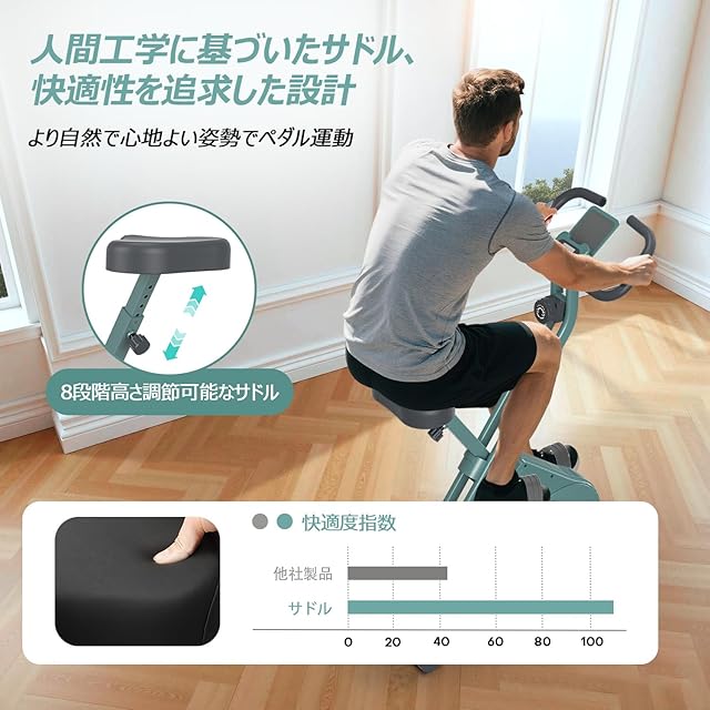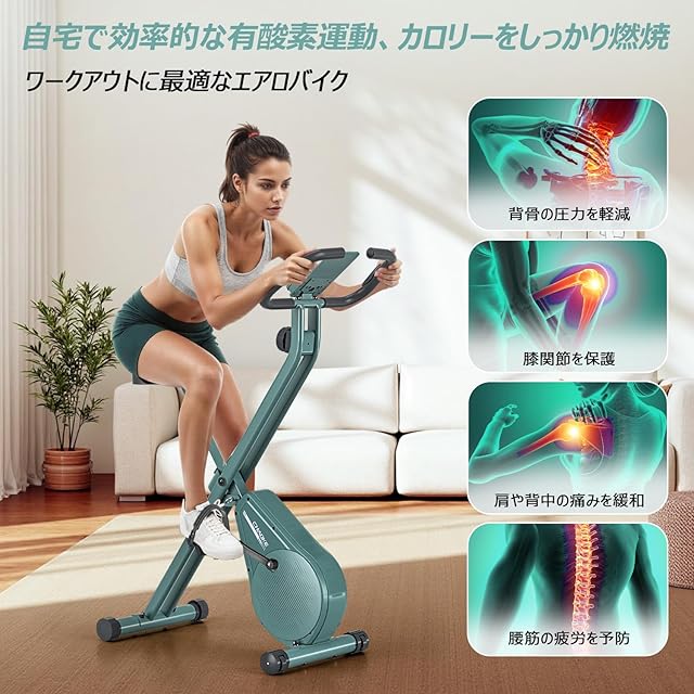 【簡単組み立て&省スペース設計】 商品は約90%完成した状態でお届け。組み立ては工具不要・平均約30分で簡単に完了します。 使用しない時はコンパクトに折りたたんで収納でき、キャスター付きで移動もスムーズ。 ワンルームやリビングにも置きやすい省スペース設計で、使いたい時にすぐ取り出せる、毎日続けやすいフィットネスバイクです。