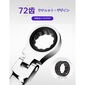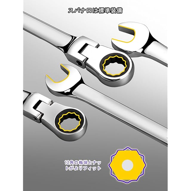 【自由な角度調整】独特の首振りデザインにより、レンチのヘッドは0~180°の範囲で柔軟に調整できます。これにより狭いスペースの障害物を回避し、十分な握りスペースを確保できます。72歯のデザインと組み合わせることで、ナットをしっかりと掴むことができ、またレンチのヘッドには回転方向を示す矢印があり、使い勝手が向上します。