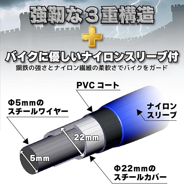 商品名:大阪繊維資材 INFIMO GUARDIAN LOCK ハードワイヤー・ビッグ 3層構造で愛車を守ります ブラック 1800mm IMA95304