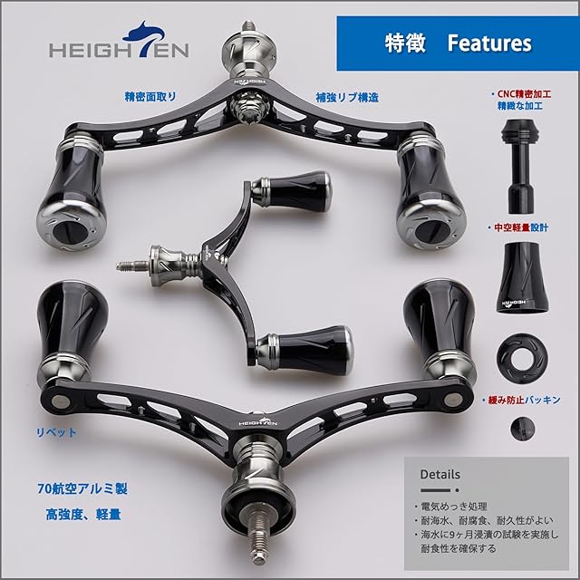 【サイズ】ハンドル軸心距離80mm/95mm/98mm、ノブ直径20mm/19mm 【80mm総重】32.5g(ダイワ用) / 37g(シマノ用)【95mm総重】34g(ダイワ用)/39g(シマノ用)【98mm総重】34g(ダイワ用)/39g(シマノ用)【素材】70シリーズ航空アルミ合金。