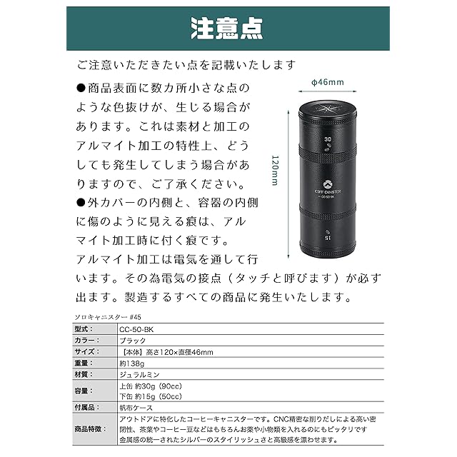 商品名:[キャンピングムーン] キャンプ コーヒー キャニスター 2段式 CNC削切 ジュラルミン 黒ギア CC-50-BK