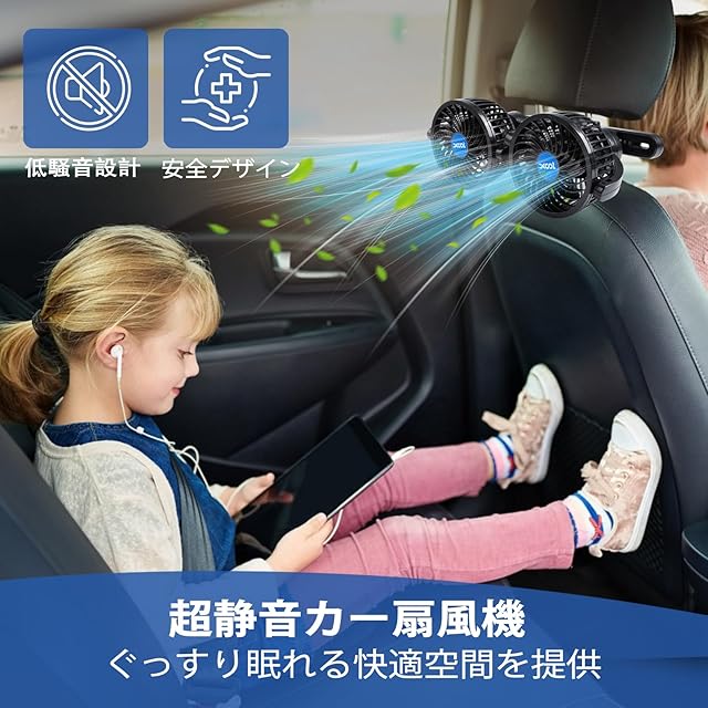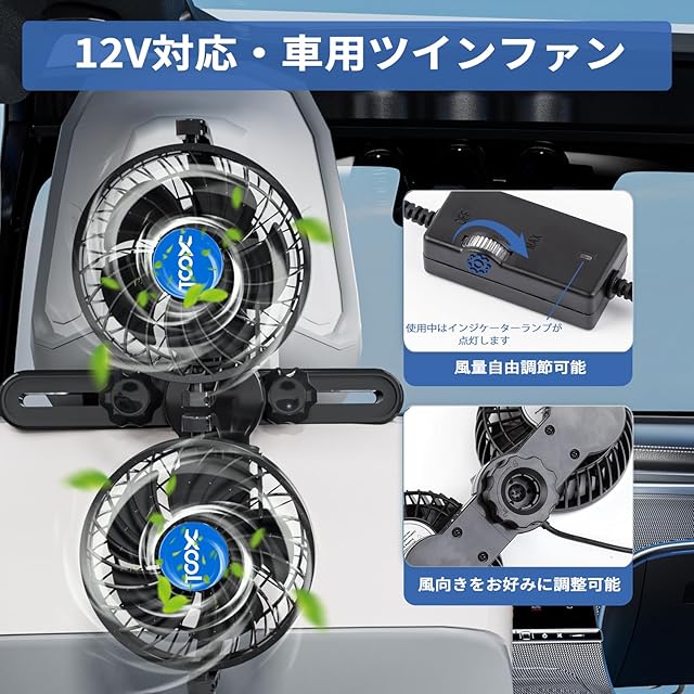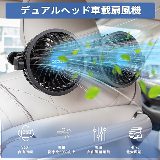 商品名:【2025新登場】XOOL 車載ツインヘッドファン カーサーキュレーター 後部座席用 360°首振り 車用サーキュレーター シガーソケット 12V 冷却ファン 扇風機 スピード調整無段階 SUV・RV・車用