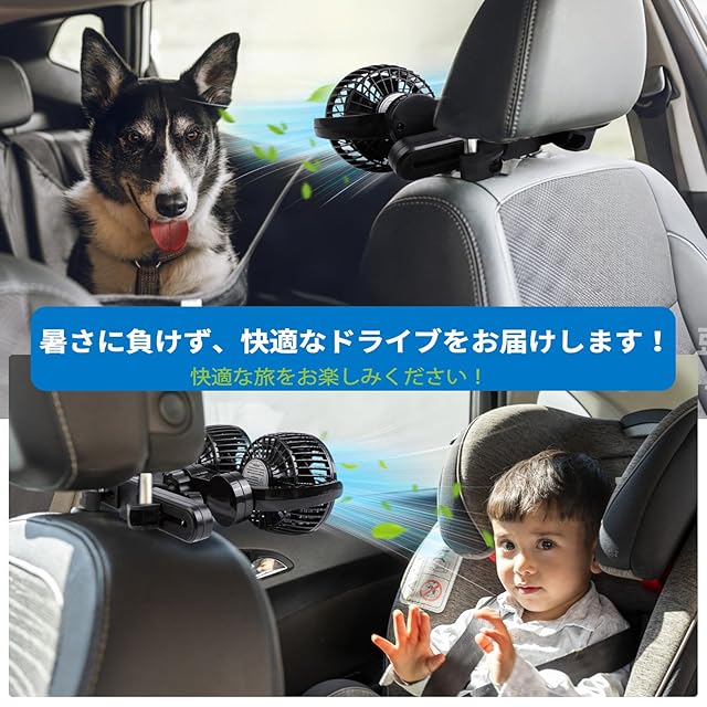【車内の暑さ対策に最適!】 XOOLの車載ファンは、2つの回転式ファンヘッドを搭載し、効率よく熱気を排出!エアコンが弱い車内でも、後部座席の乗客やペットにパワフルな風を届け、すぐに涼しく快適に。静音設計で、休憩中も快適な環境をキープします。