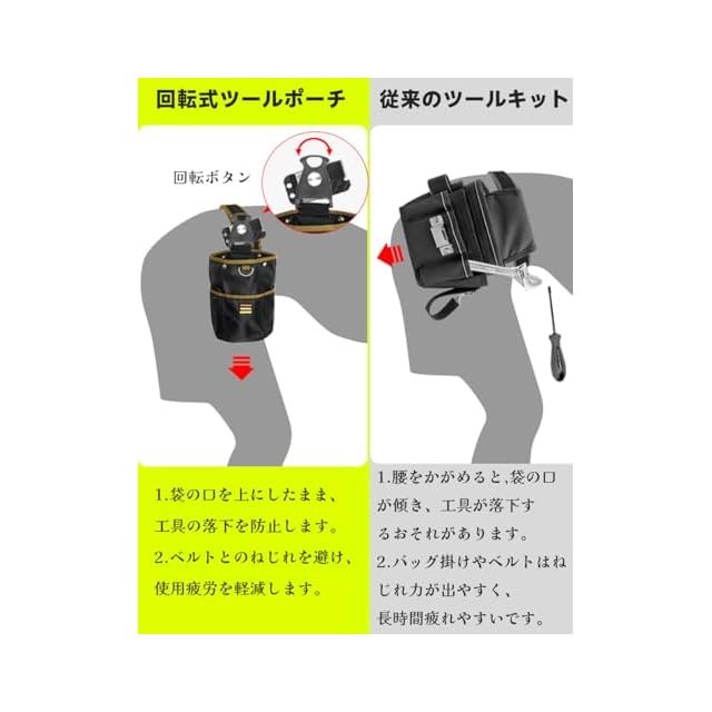 【回転式ボディ|狭い空間でも柔軟に】 ※360°回転可能:狭い場所や体の向きを変えながらの作業でも、ツールポーチが自然に回転し、快適にアクセス可能。※ベルト不要の取り外し:ワンタッチで簡単に装着・取り外しが可能。作業中も邪魔になりません。