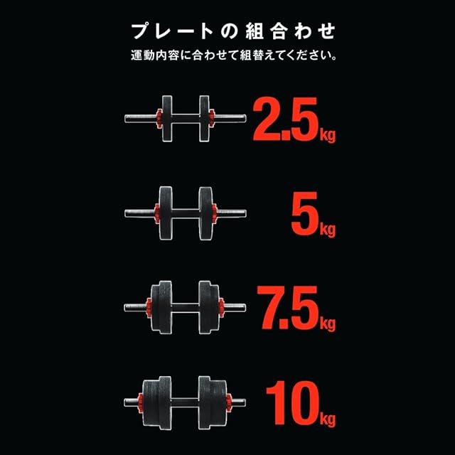 プレートを入れ替えて2.5kg、5kg、7.5kg、10kgに重量調節ができるので、初心者でも使いやすいダンベルです。
