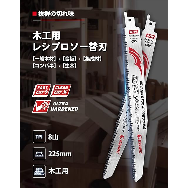 商品名:EZARC(イザーク) レシプロソー替刃 木工用 全長225mm 8山 綺麗 高速切断 クロムバナジウム鋼 衝擊燒入 長寿命 木材·合板·集成材·生木 (5本入)