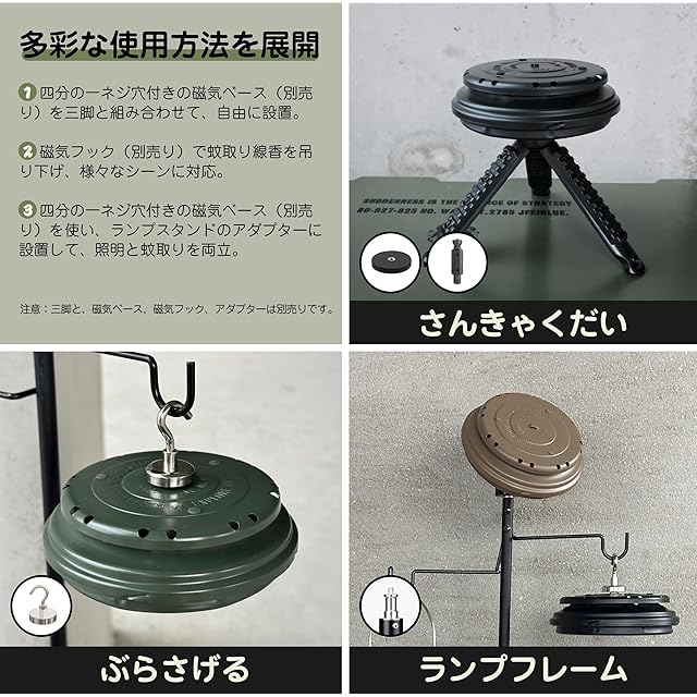 多様な遊び方を展開できます:1. 四分の一ネジ穴付きの磁気ベース(別売り)を三脚と組み合わせて、自由に設置。2. 磁気フック(別売り)で蚊取り線香を吊り下げ、様々なシーンに対応。3. 四分の一ネジ穴付きの磁気ベース(別売り)を使い、ランプスタンドのアダプターに設置して、照明と蚊取りを両立。注意:磁気ベース、磁気フック、アダプターは別売りです。