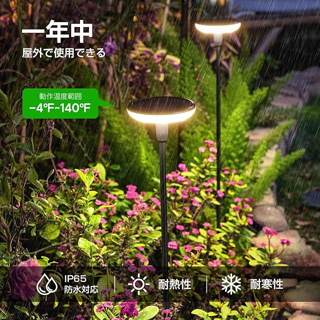 √【高品質&IP67防水】従来の太陽ライトより大きい太陽電池パネルを使用して下さい、太陽電池パネルは単結晶のケイ素に改善しました、1000mAhの充電池を内蔵、25% より多くの日光の転換の効率。日中は6~8時間充電、夜は10~12時間自動点灯、庭ライトはIP67防水認証も取得、雨、雪、霜を心配する必要がない、全天候対応可能、家の外で使うのに適して、あなたのために夜を照らすのです。