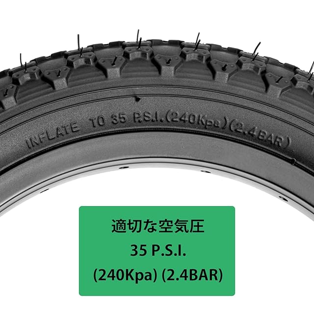 タイヤサイズ:14x2.125インチ、ETRTO: 57-254 mm。空気圧35 PSIまで膨らませてください。インナーチューブサイズ:14x1.75-2.125インチ、AV 32mmシュレーダーバルブ。