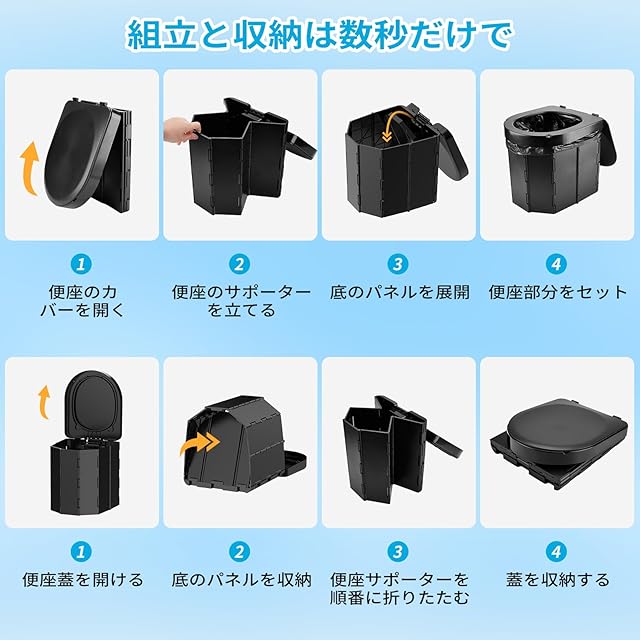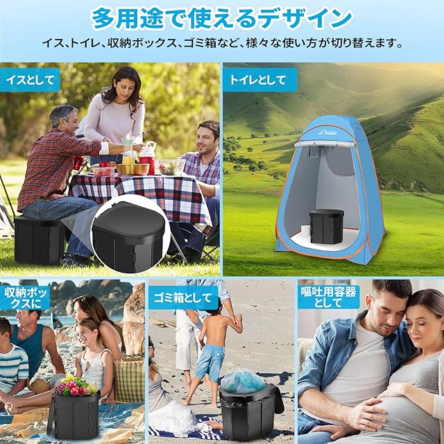 5.【多用途】:折り畳んでいるパーツを展開するだけで非常に短時間で組み立てが完了し、お年寄りや子供でも簡単に組み立てることができます。車載用やキャンプ用のトイレに適しているだけでなく、ゴミ箱、収納箱、釣り、ハイキング、ボート、狩り、渋滞などの非常用トイレとしてもお使いいただけます。