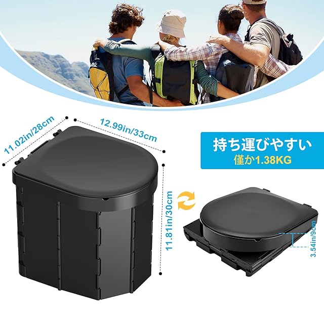 4.【商品仕様】:本体トイレ*1pcs、収納袋*1枚、処理袋*12枚。本体サイズ:(約) 33×28×30cm、重さ:(約)1.38kg。折畳みサイズ:(約) 33×28×9cm。普段は隙間に収納できで、軽量で持ち運びが簡単です。これはキャンプや長距離旅行に最適な車載用 簡易トイレ であり、屋外で緊急時に使用することができます。