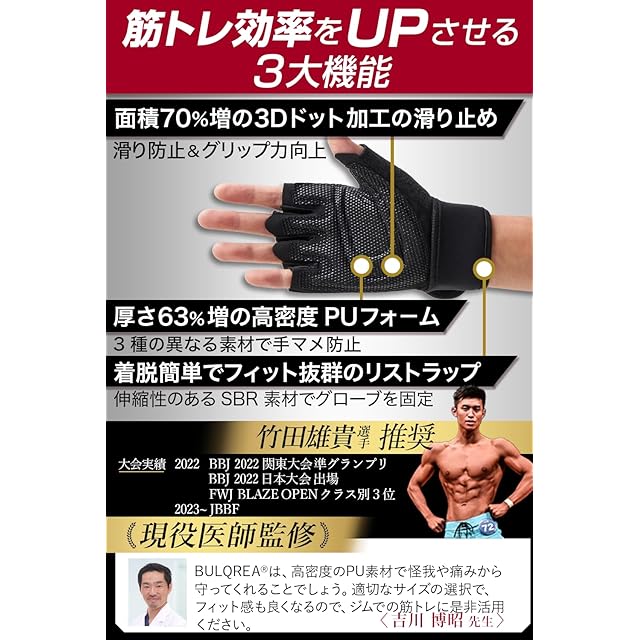 商品名:【医師監修】トレーニンググローブ【滑り止め面積70%UP】マメ防止 3層構造 ハニカム メンズ レディース 筋トレ ジム BULQREA (ブラック, S)