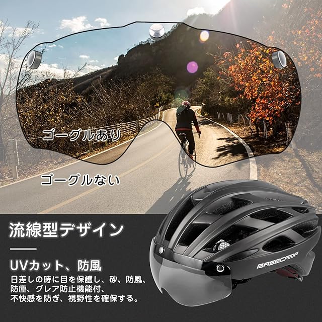 商品名:Basecamp(ベースキャンプ) 自転車用ヘルメット EN1078マーク バイクヘルメット バイクヘルメット リアライト 57~62cm 磁気ゴーグル付 ポータブルバックパック付き CPSC認定済み 軽量 調節可能 大人用 メンズ レディース マウンテンバイク/ロードバイク BC-069
