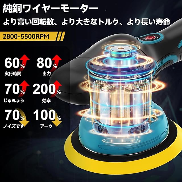 【パワフルで6段階の変速機能搭載】:このポリッシャーは高品質の純銅モーターを採用し、強力かつ安定したパワーを提供します,最大5500rpmの回転数を実現し。6 つの速度設定を提供し、ニーズに応じてポリッシャーを柔軟に調整できます。穏やかなワックスがけや研磨には低速、徹底的なバフがけやクリーニングには中速、頑固な欠陥や酸化の除去には高速でも、このオービタルポリッシャーはあらゆる用途に対応します。