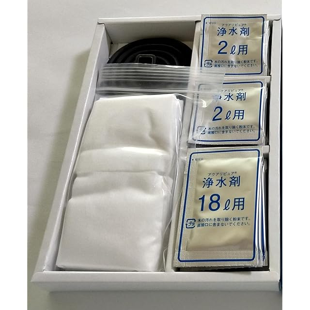 セット内容:・2L用浄水剤(20袋) ・18L用浄水剤(10袋) ・折り畳みシリコンロート(1個) ・ろ過用脱脂綿(20枚)