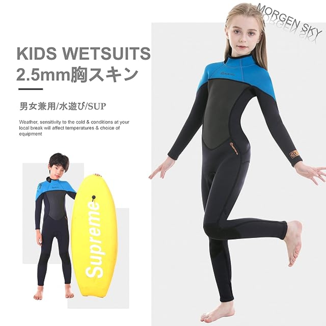 MORGEN SKY ウェットスーツ キッズ 水着 2.5mm 子供用 フルスーツ ラッシュガード マリンスポーツ ダイビング 水遊び プール 長袖 長ズボン 防寒保温 日焼け止め 男の子 女の子 上下一体 R001(子供タイプA ブルー,M)