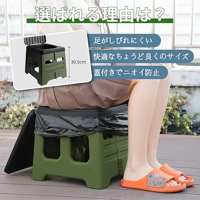 商品名:簡易トイレ 携帯トイレ 非常用トイレ 災害用トイレ ポータブルトイレ 車 防災グッズ 折り畳み 介護トイレ 【耐荷重150kg 蓋付き】 地震 キャンプ アウトドア 断水時用 収納袋、ゴミ袋2ロール付き グリーン