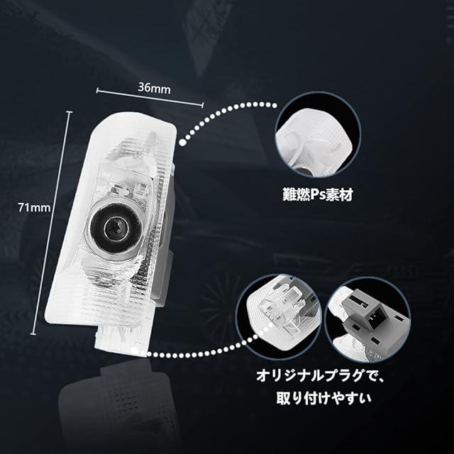 ⑤取り付け簡単:交換は簡単で、ケーブルがなく、古いドアのランプだけを交換します。ドアを開けると、マークは地上に投影される。注:車両にドア照明がない場合は、ウェルカム ランプを設置することは推奨されません。ご注意ください!