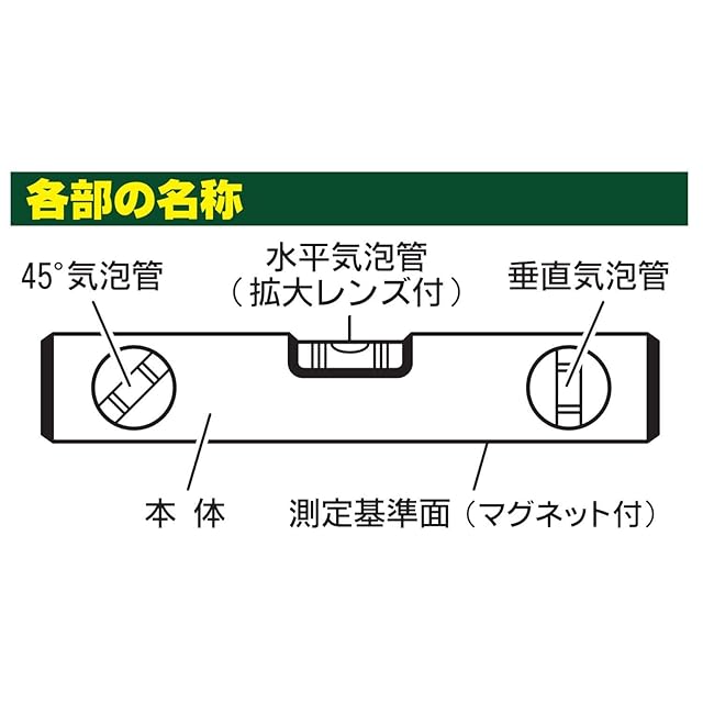 精度:水平気泡管±1.00mm/m=±0.0573度以内、垂直・45度気泡管±1.50mm/m=±0.0859度以内