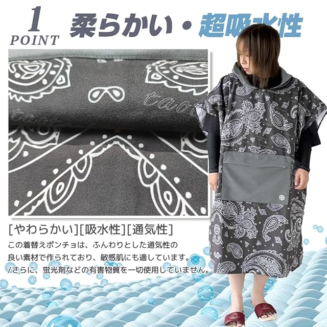 商品名:TaoTech 着替え ポンチョ 薄手 サーフポンチョ バスタオル 海水浴 プール スイミング キャンプ フード ポケット 付き (ブラックペイズリー)