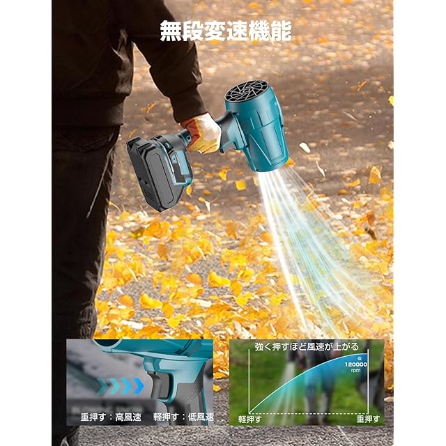 【風量調整可能&無断変速】この無段階変速なブロワーは、さまざまな作業に応じた風量と風速の調整が可能です。やさしく押すと風量が小さく、強く押すと風量が大きくなり、押す力によって風量が変化します。ブロワーは12枚の大型ファンブレードを組み合わせて設計されており、ブレードの直径と枚数を増やすことで、気流がより均等に分散され、気流損失が減少します。 洗車の水滴を吹き飛ばすだけでなく、キーボードの掃除、庭の落ち葉落とし、除雪、ホコリやゴミの除去など、幅広い用途があります。