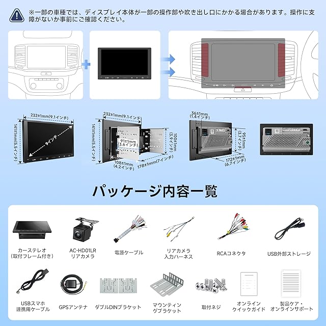 9インチIPS アンドロイドナビ: 178°の広視野角とリアルな色彩を誇る9インチIPSディスプレイ(1280x720)で、鮮やかなビジュアルを体験!電話ミラーリング(一部の非CPAAアプリも対応)や分割画面機能で、デュアルアプリをスムーズに管理可能