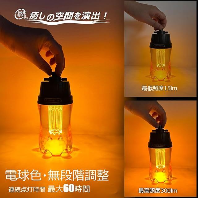【仕様】効率:5W・ 全光束:約300lm・ 発光色:電球色(2000K±5%)・ 照射角度:360°・ 調光機能:無段階調節可能・ 点灯時間:3~60時間・ 充電時間:約2~3時間・ 防水等級:IP65(生活防水)・ 電池寿命:充放電サイクル回数約500回・ 充電電圧:DC5V/1A・ 質量:約200g・ 本体のサイズ:直径70.5*188 mm・ 化粧箱のサイズ:約84*74*163mm・ 材質:PC、ABS・ セット内容:ライト本体、Type-C充電ケーブル、取扱説明書、書