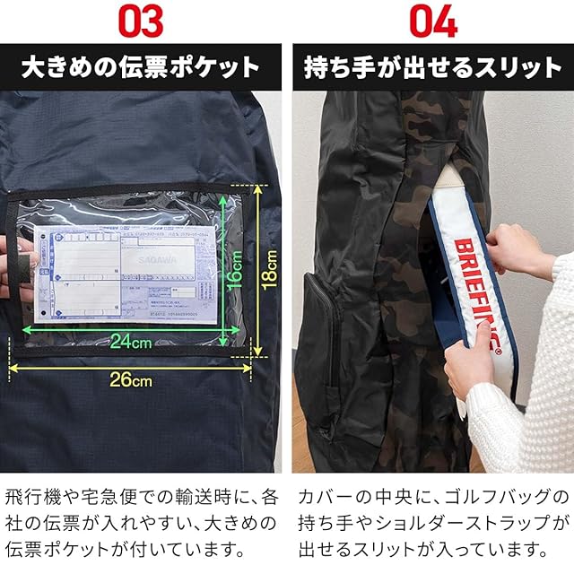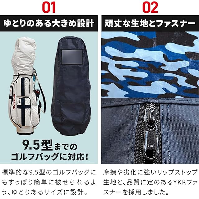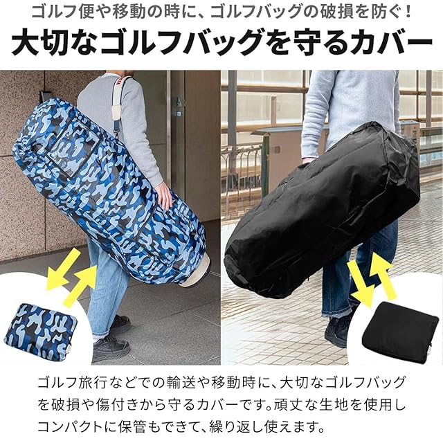 【ゴルフ便や移動時のゴルフクラブ・バッグの破損・汚損対策に】 ゴルフ旅行などでの輸送や移動時に、大切なゴルフバッグを破損や傷付きから守るカバーです。頑丈な生地を使用しているので、繰り返し使えてコスパも抜群です。 【ゆとりのある大きめ設計】 標準的な9.5型のゴルフバッグにもすっぽり簡単に被せられるよう、ゆとりあるサイズに設計。取り付け、取り外しがサクッとできます。 【頑丈な生地とファスナー】 600Dのしっかりした厚みのリップストップ生地を採用。摩擦や劣化に強く、万が一破れても裂け目が広がりにくいのが特長です。 【大きめの伝票ポケット】 飛行機や宅急便での輸送時に、各社の伝票が入れやすい、大きめの伝票ポケットが付いています。 【コンパクトに折りたためる】 たたむとコンパクトになり、使用していない時も場所を取りません。保管や持ち運びにも便利です。 【繰り返し使える】 頑丈で繰り返し使える上に、保管用のカバーとしても活躍するので宅配便・配送業者のカバーを都度購入するより断然お得でコスパ抜群です。
